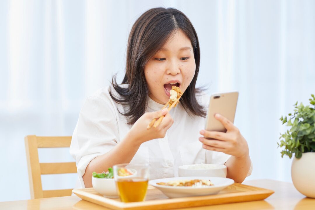スマホを見ながら食べると、食事そのものに集中できず、どれだけ食べたか覚えていなかったり、味も満足度も薄くなりやすいのです。そうなると、結果的に量も増えがち。